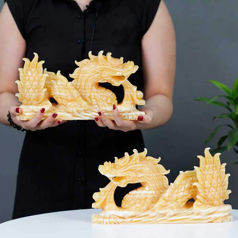 Sở dĩ, tượng rồng đá được chế tác từ Ngọc Hoàng Long bởi nó có khả năng mang đến nhiều tác dụng “thần kỳ”. Đặc biệt là cải thiện đời sống tình cảm vợ chồng, mang đến may mắn cho người sở hữu. Màu vàng của ngọc cũng tượng trưng cho sự tốt lành và thịnh vượng.
